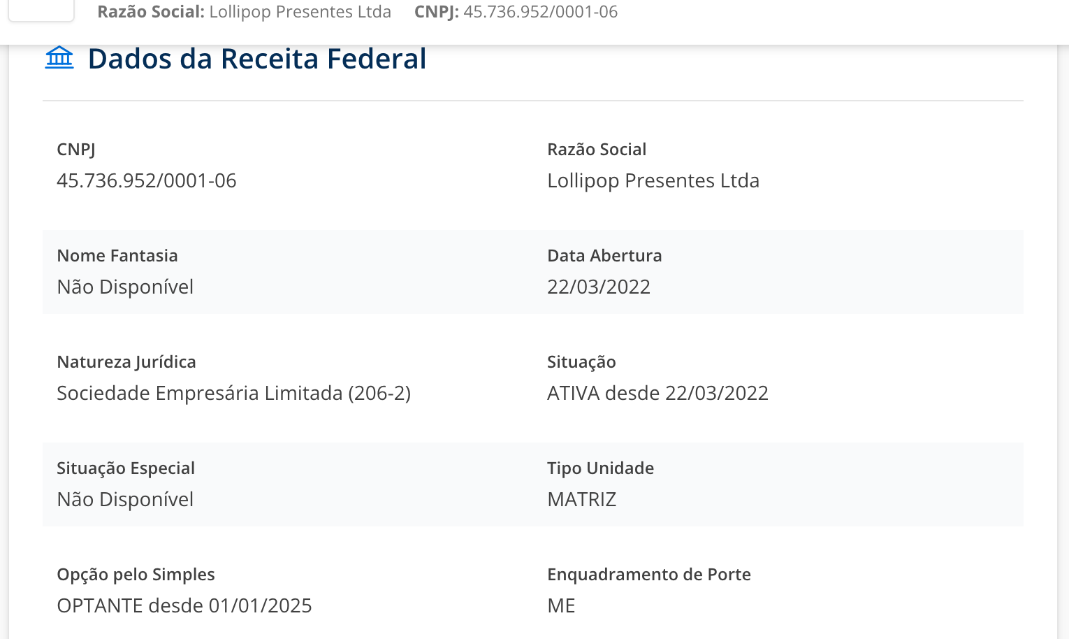 A Lollipop Presentes possui endereço físico, equipe própria e CNPJ regularizado — um dos fatores mais importantes na avaliação de lojas online confiáveis.