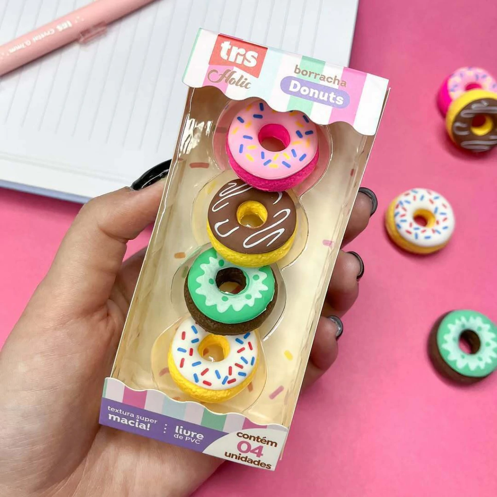 Adicione um toque de diversão à sua papelaria e transforme seu momento de estudos em uma experiência deliciosa com o Kit de Borrachas Donuts Holic da Tris. As borrachas mais fofas e criativas para o seu material escolar!