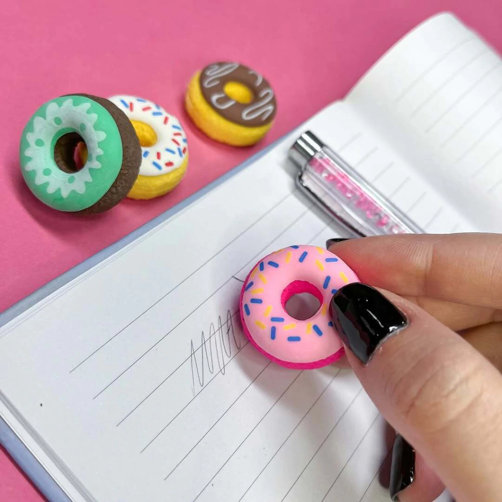 O kit contém 4 borrachas em formatos diferentes de donuts, cada uma com uma cobertura única, permitindo personalizar. Perfeitas para quem ama produtos criativos e divertidos, essas borrachas são ideais para presentear ou para quem quer dar um toque especial à sua rotina.